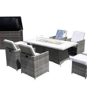 Ten Piece Outdoor Gray Wicker Multiple Chairs Seating Group Fire Pit Included with White Cushions
