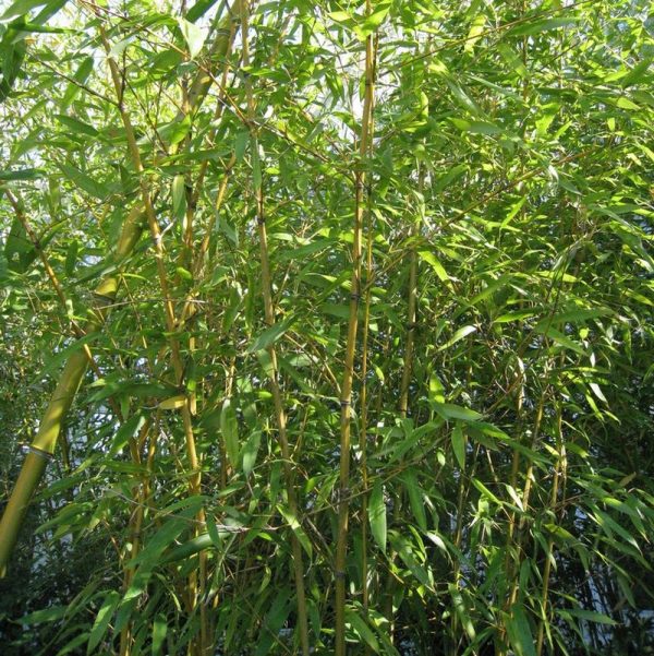Running bamboo with golden cast. Does best in rich, deep soil, regular water and fertilizer. Protect from wind. Can grow to fifteen feet high, but usually lower. Contain Plants with root barriers or dry area; will spread indefinitely. Good in pots.