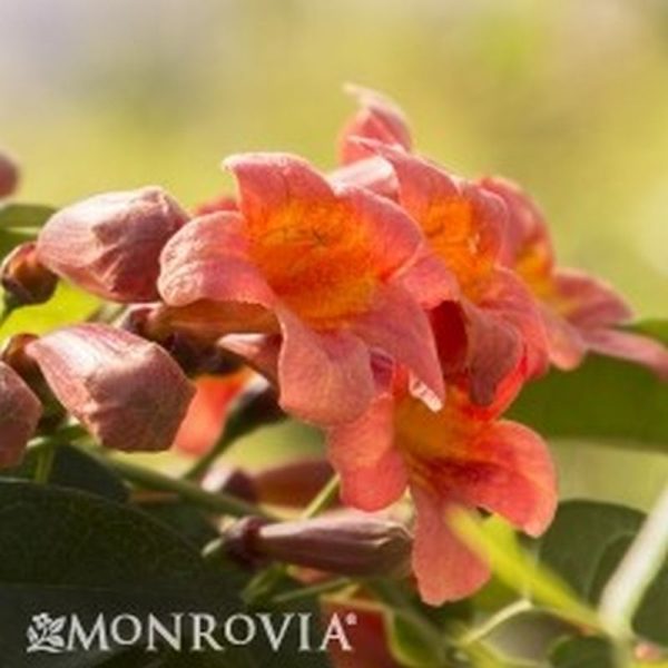 Fast growing vine to 30 feet has bright tangerine flowers off and on most of the year. Attaches to surfaces by tendrils; grows in nearly any condition. Likes full to part sun, moderate water. Groom as needed for form and control.