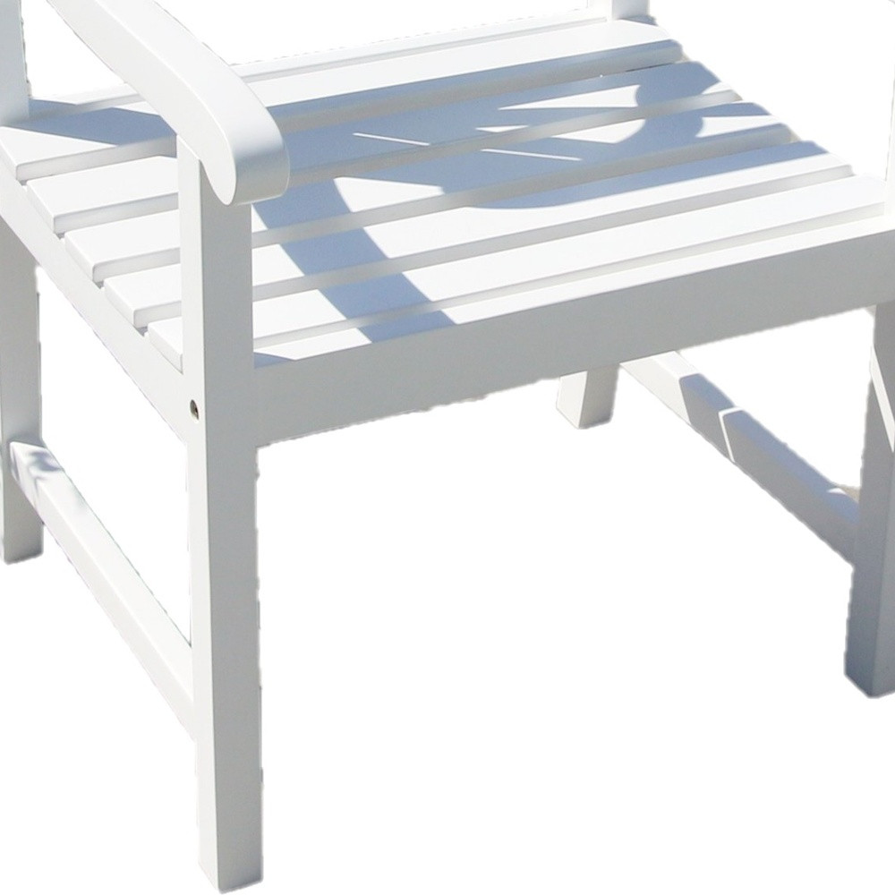 This White Garden Armchair looks gorgeous in your garden, patio, or other outdoor patio space. The slatted design on the seat prevents water from pooling, and the fun cross design on the slats on the back provides a unique and elegant tone. The beautiful white finish will surely impress anyone who visits your outdoor space. This chair is made from 100% premium quality Acacia hardwood that is prone to resist mold, mildew, and decay. 34″ H x 24″ W x 24″ D.